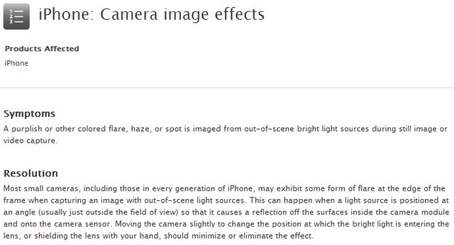 «Πολλές μικρές φωτογραφικές μηχανές, συμπεριλαμβανομένων αυτών που βρίσκονται σε κάθε γενιά iPhone μπορούν να παρουσιάσουν κάποιας μορφής λάμψη στα άκρα της φωτογραφίας όταν λαμβάνουν φωτογραφίες με πηγές φωτός που βρίσκονται εκτός της σκηνής» αναφέρει η εταιρεία.
