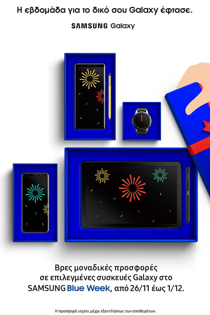 Η Samsung Electronics Hellas διοργανώνει για πρώτη φορά Samsung Blue Week. Στο πλαίσιο της Samsung Blue Week (26 Νοεμβρίου έως 1η Δεκεμβρίου) οι καταναλωτές μπορούν να βρουν επιλεγμένα μοντέλα smartphones, tablets και wearables από όλες τις σειρές Samsung Galaxy σε μοναδικές προσφορές.