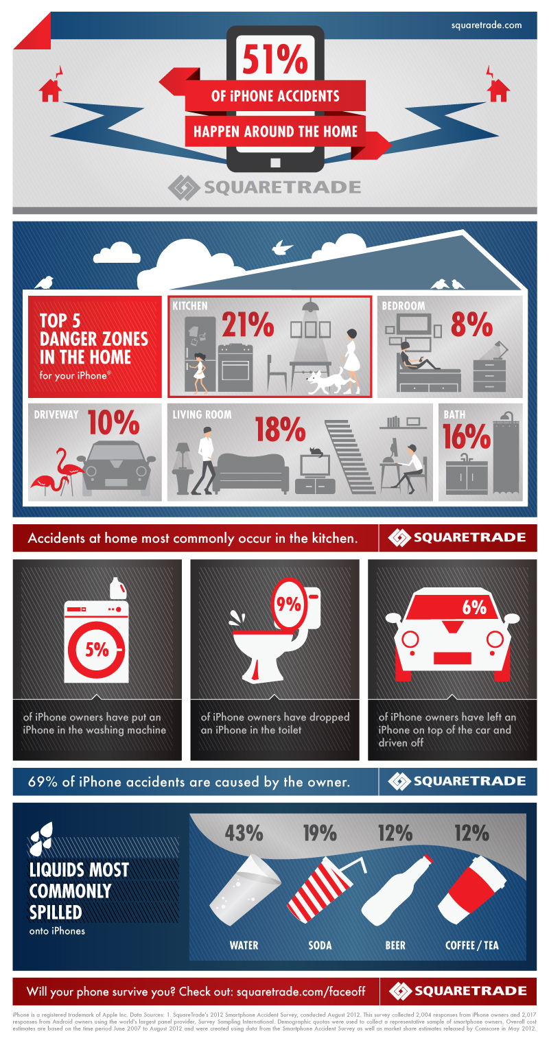 Τα πιο πολλά ατυχήματα με το iPhone συμβαίνουν στην κουζίνα, στο σαλόνι, στο μπάνιο και στην κρεβατοκάμαρα σύμφωνα με έρευνα για τις «επικίνδυνες ζώνες στο σπίτι» της SquareTrade.