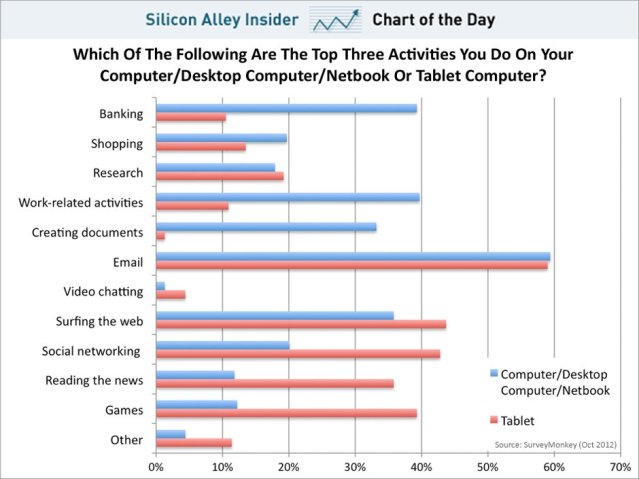 Τα αποτελέσματα δίνουν σαφές προβάδισμα στα tablets σε κάποιες δραστηριότητες, όχι όμως σε όλες. Συγκεκριμένα, οι χρήστες tablets τα χρησιμοποιούν περισσότερο για παιχνίδια, ενημέρωση και κοινωνικά δίκτυα, κάτι που σίγουρα οφείλεται στην φορητότητά τους ενώ το περίεργο είναι πως ακόμα και στη χρήση του διαδικτύου ξεπερνούν τους υπολογιστές κατά περίπου 8%.