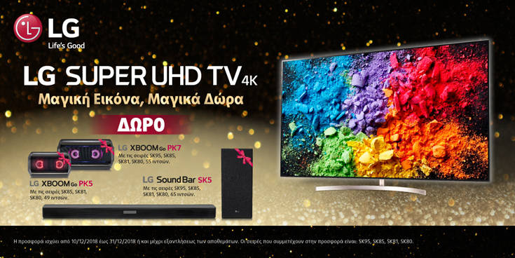 Μαγικά Χριστούγεννα θα κάνουν οι καταναλωτές που θα επιλέξουν μια LG SUPER UHD 4K της LG Electronics (LG), από τη Δευτέρα, 10 Δεκεμβρίου 2018 έως και τη Δευτέρα, 31 Δεκεμβρίου 2018 ή μέχρι εξαντλήσεων των αποθεμάτων ή των δώρων.