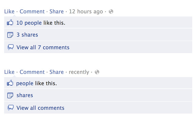 Χρησιμοποιώντας το Facebook Demetricator, όλες οι μετρήσεις των «likes», «shares» ακόμα και των φίλων εξαφανίζονται. Το «αρέσει σε 10 άτομα» για παράδειγμα γίνεται σκέτο «αρέσει σε άτομα». Αυτό γίνεται σε όλες τις αυτόματες μετρήσεις, όπως «likes» και «shares» και όχι σε αριθμούς που έχουν εισαχθεί από τους ίδιους τους χρήστες, όπως ημερομηνίες γενεθλίων ή ενημερώσεις της κατάστασης τους.