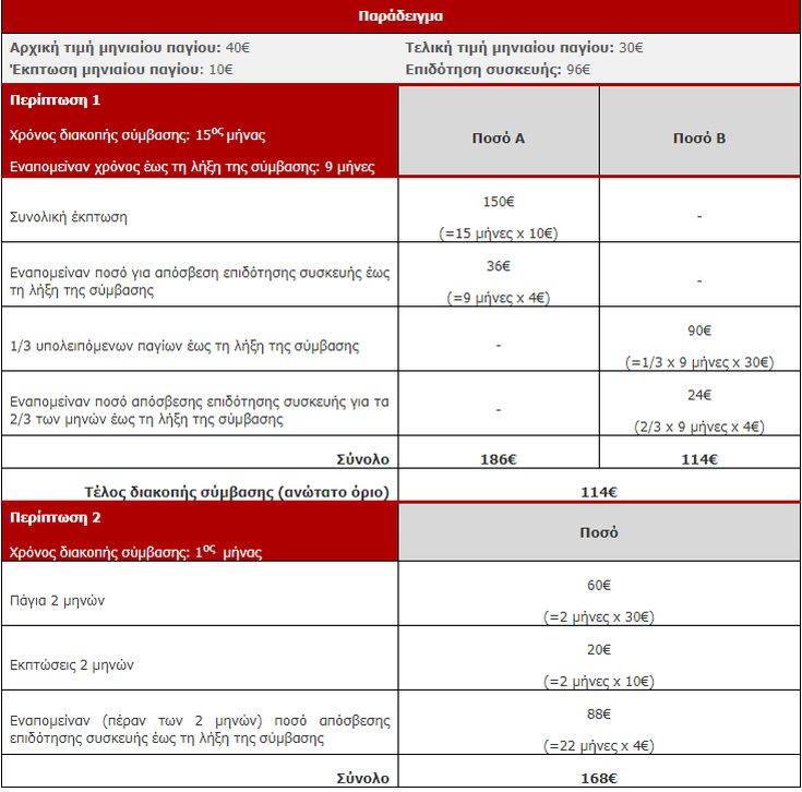 - Το ποσό απόσβεσης για τυχόν επιδότηση συσκευής, τερματικού εξοπλισμού ή κατασκευής γραμμής, το οποίο αντιστοιχεί στα 2/3 του εναπομείναντος διαστήματος από την ημερομηνία διακοπής μέχρι την προβλεπόμενη ημερομηνία λήξης της σύμβασης.Επισημαίνεται ότι, στην πρώτη σελίδα της σύμβασης ορισμένου χρόνου θα πρέπει να αναγράφεται το τέλος πρόωρης διακοπής που θα οφείλει, κατά περίπτωση και για κάθε μήνα διακοπής, να καταβάλει ο συνδρομητής.