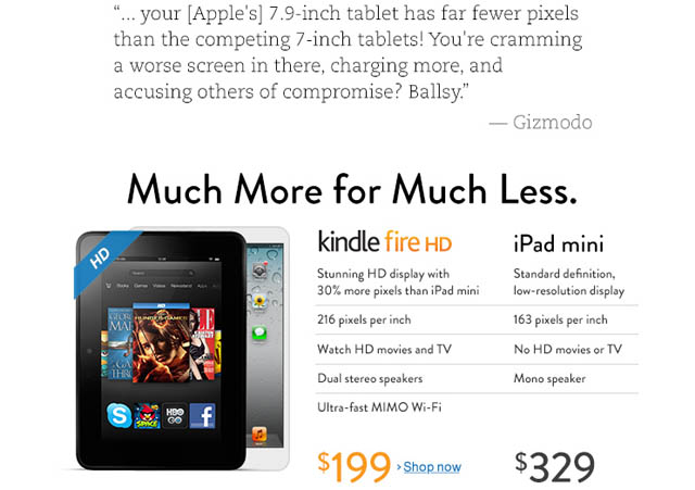 Με τον χαρακτηρισμό «πολύ περισσότερα για πολύ λιγότερα» η εταιρεία σε μια σύγκριση αναδεικνύει τα ισχυρότερα τεχνικά χαρακτηριστικά του Kindle Fire HD, όπως την μεγαλύτερη ανάλυση και πυκνότητα εικονοστοιχείων της οθόνης της, την υποστήριξη ταινιών υψηλής ποιότητας και τα στερεοφωνικά ακουστικά, αλλά και την αρκετά χαμηλότερη τιμή του. Στο γραφικό της διαφήμισης μάλιστα το Kindle Fire HD φαίνεται να «κρύβει» το iPad Mini.