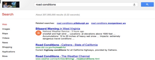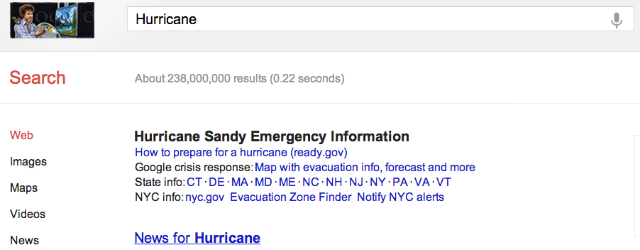 Οι χρήστες μπορούν να αναζητούν μέσω του Google συγκεκριμένα φαινόμενα, όπως το «Sandy Superstorm» αλλά και να πραγματοποιούν αναζητήσεις βάση της τοποθεσίας τους. Πληκτρολογώντας για παράδειγμα «New York» ή «τυφώνας» στην αναζήτηση, το πρώτο αποτέλεσμα εμφανίζει τοπικό δελτίο έκτακτων καιρικών φαινομένων που αναφερόταν στις πλημμύρες που έπληξαν την πόλη ως αποτέλεσμα του τυφώνα.