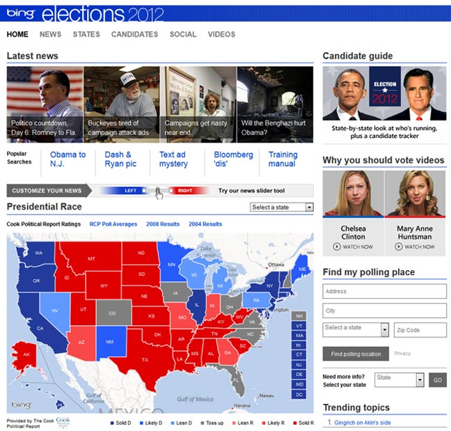 Το Bing της Microsoft αποκάλυψε στις 30 Οκτωβρίου το «Elections 2012», όπου οι πολίτες μπορούν να βρουν συγκεντρωμένα όλα τα πρόσφατα νέα που έχουν να κάνουν με Ομπάμα και Ρόμνεϊ. Στη συγκεκριμένη σελίδα υπάρχουν ακόμη οι τελευταίες δημοσκοπήσεις και οι δημοφιλείς αναλύσεις που έχουν γίνει για τις εκλογές σε Facebook και Twitter.