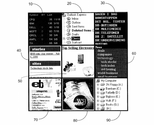 Με λίγα λόγια η πατέντα ‘403 αναφέρεται στην «παρουσίαση πολλών πληροφοριών από διαφορετικές πηγές σε μια συσκευή προβολής». Περιγράφει αναλυτικά ένα γραφικό περιβάλλον που «οργανώνει το περιεχόμενο από διάφορες πηγές πληροφοριών σε πλακίδια, κάθε ένα από τα οποία μπορούν να ανανεώσουν το περιεχόμενο του ανεξάρτητα από τα άλλα».