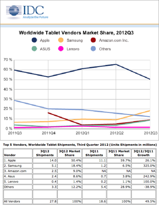 Το μερίδιο της Apple εμφανίζεται εμφανώς μειωμένο, στο 50,4%, από 59,7% το τρίτο τρίμηνο του 2011 και 65,5% το δεύτερο τρίμηνο του 2012. Την ίδια στιγμή, το μερίδιο της Samsung και της Amazon ανεβαίνει σημαντικά.