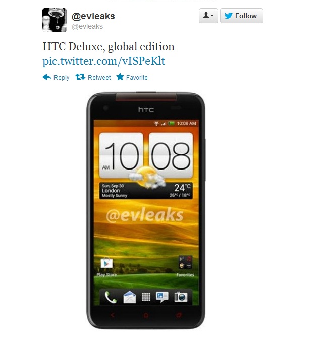Η ευρωπαϊκή έκδοση της συσκευής θα κυκλοφορήσει με το όνομα HTC Deluxe. Η αποκάλυψη έγινε στο twitter από τον χρήστη @evleaks ο οποίος γενικώς διαθέτει αρκετά καλό ιστορικό στις διαρροές του.