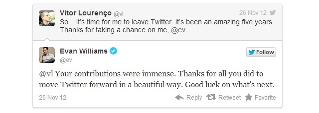 Πριν μερικές ώρες ο Lourenco με μια λιτή ανακοίνωση, μέσω ενός tweet, ενημέρωσε για την απόφαση του να αποχωρήσει από το δημοφιλές site και με την ευκαιρία ευχαρίστησε τον Evan Williams που τον εμπιστεύτηκε και του έδωσε την δυνατότητα να δουλέψει για το συγκεκριμένο πρότζεκτ.
