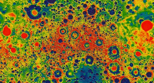 Ο χάρτης του φυσικού δορυφόρου της Γης απεικονίζει διακυμάνσεις της βαρύτητας που προκαλούνται είτε από τα εξογκώματα (π.χ. βουνά), είτε από τα βαθουλώματα του εδάφους (π.χ. κρατήρες), αλλά και από τις βαθύτερες γεωλογικές δομές στο εσωτερικό του.
