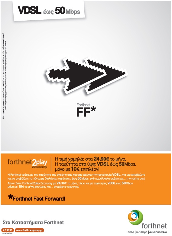 H Forthnet ανακοινώνει την παράταση ισχύος των δημοφιλών προσφορών της: Forthnet 2play Economy με μόνο 24,90€ ανά μήνα και Forthnet ADSL με μόνο 17,90€ ανά μήνα, ενώ ταυτόχρονα δίνει την δυνατότητα αύξησης της ταχύτητας πρόσβασης στα 50 Mbps μέσω τεχνολογίας VDSL, με μόνο 10€ ανά μήνα.