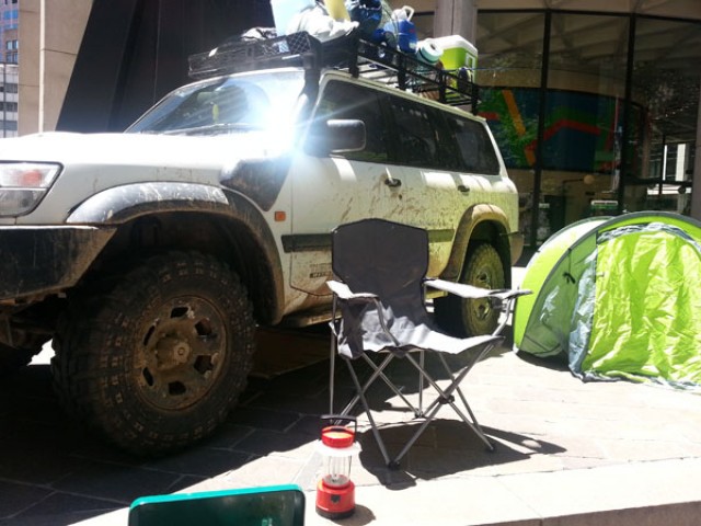 Η νέα διαφημιστική ιδέα έχει τοποθετηθεί στη George Street του Σίδνεϊ και περιλαμβάνει ένα poster που δείχνει τη συσκευή της Samsung, ένα τζιπ και κάποια είδη κάμπινγκ.