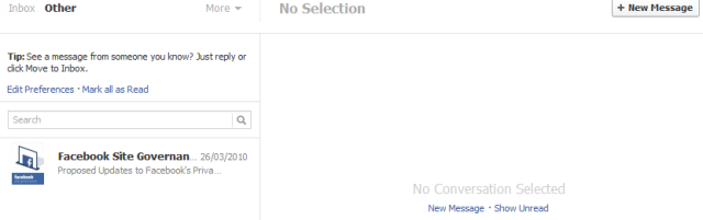 Το κοινωνικό δίκτυο χωρίζει τα εισερχόμενα μηνύματα σε δύο κατηγορίες, αυτά που προέρχονται από άτομα που ανήκουν στην friend list (στους φίλους σας δηλαδή), και αποστέλλονται άμεσα στα εισερχόμενα (inbox) και τα μηνύματα που στέλνουν οι υπόλοιποι χρήστες και αποθηκεύονται σε έναν άλλο φάκελλο που ονομάζεται «Other».
