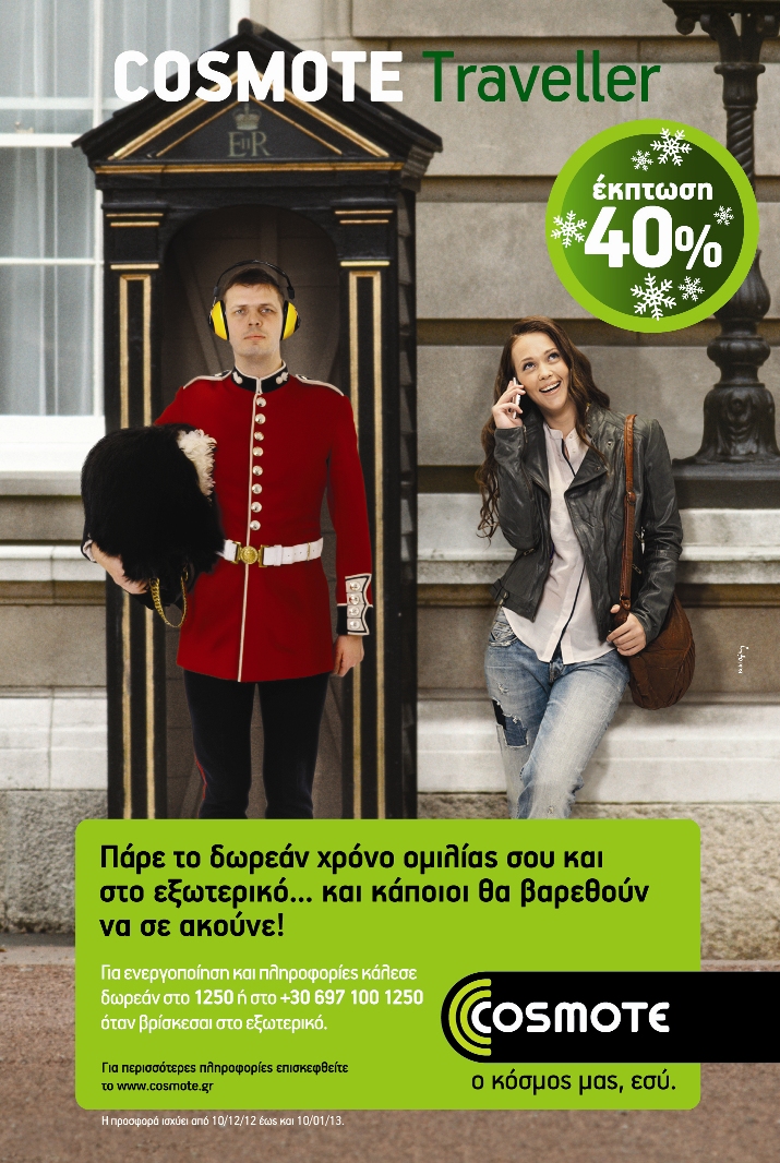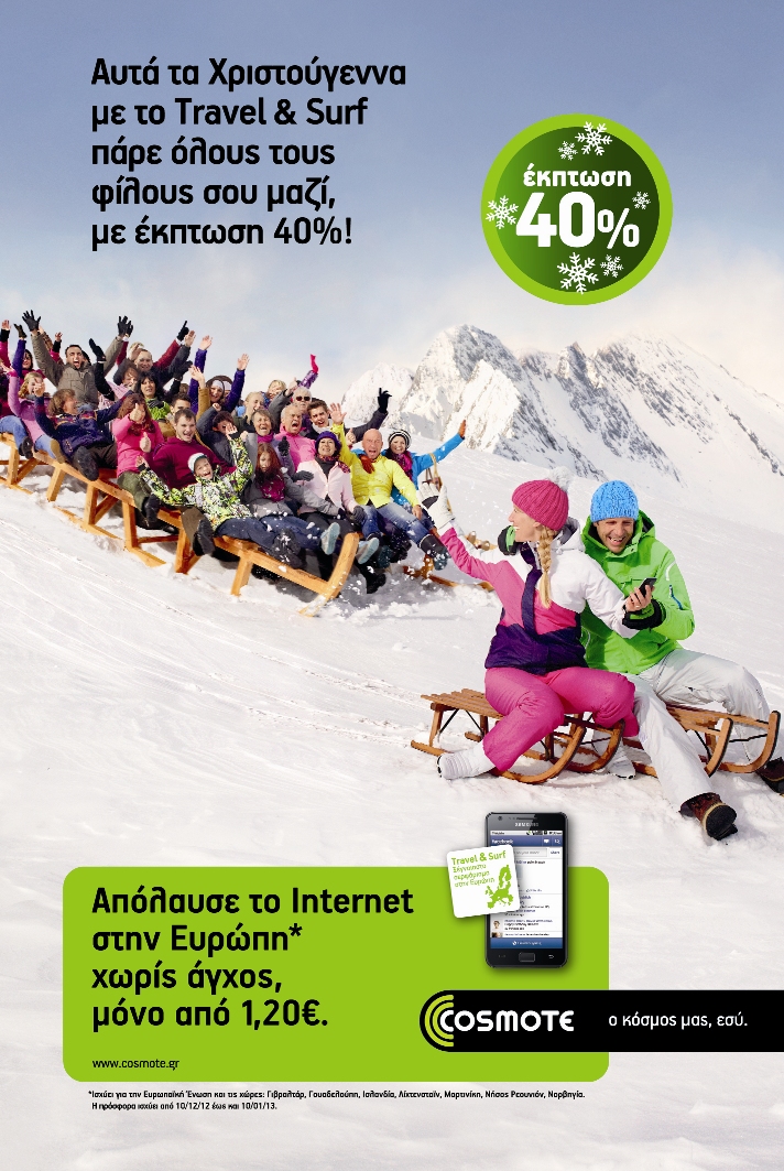 Από τις 10 Δεκεμβρίου 2012 έως και τις 10 Ιανουαρίου 2013 οι συνδρομητές COSMOTE που θα βρεθούν φέτος τις γιορτές σε χώρες της Ευρωζώνης (Αφορά χώρες της Ευρωζώνης Α & Β – Αυστρία, Βέλγιο, Βουλγαρία, Γαλλία, Γαλλική Γουιάνα, Γερμανία, Γιβραλτάρ, Γουαδελούπη, Δανία, Εσθονία, Ην. Βασίλειο, Ιρλανδία, Ισλανδία, Ισπανία, Ιταλία, Κύπρος, Λετονία, Λιθουανία, Λιχτενστάιν, Λουξεμβούργο, Μάλτα, Μαρτινίκη, Νήσος Ρεγιουνιόν, Νήσοι Αλαντ, Νορβηγία, Ολλανδία, Ουγγαρία, Πολωνία, Πορτογαλία, Ρουμανία, Σλοβακία, Σλοβενία, Σουηδία, Τσεχία, Φινλανδία), θα επωφεληθούν 40% έκπτωση στις πρόσθετες υπηρεσίες COSMOTE Traveller & Travel & Surf. Συγκεκριμένα η έκπτωση αφορά στο πάγιο τέλος κλήσης φωνής για το COSMOTE Traveller και στην αγορά ημερήσιου πάσου δεδομένων για το Travel & Surf.