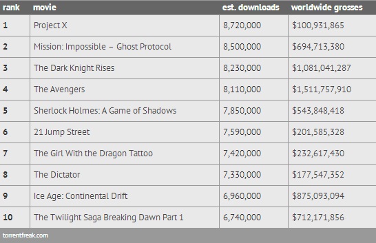 Το Project X προηγείται στη λίστα με 8.720.000 παράνομα downloads με το Mission: Impossible – Ghost Protocol και το The Dark Knight Rises να ακολουθούν στην δεύτερη και τρίτη θέση αντίστοιχα.
