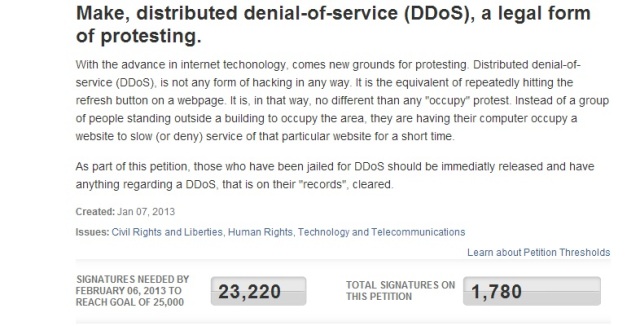 Με αφορμή το γεγονός πως ο Λευκός Οίκος εγκαινίασε την ιστοσελίδα «We the People», στην οποία οι πολίτες μπορούν να προτείνουν τα αιτήματα τους, πολλοί οπαδοί των Anonymous, ήδη έκαναν αίτηση, ώστε οι επιθέσεις DDoS της ομάδας, να πάψουν να θεωρούνται κακόβουλες ενέργειες και να αναγνωριστούν ως πράξεις διαμαρτυρίας.