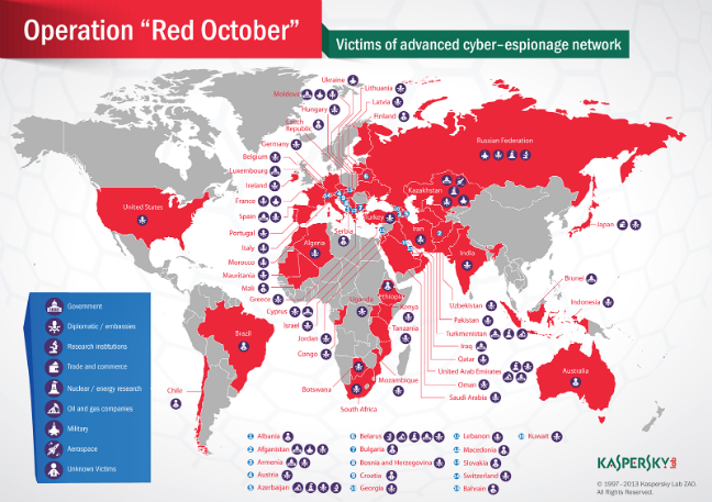 Οι επιθέσεις έγιναν από μία ομάδα με την ονομασία «Operation Red October», με τη χρήση ειδικού λογισμικού, τύπου malware, που είχε σαν στόχο την υποκλοπή σημαντικών εγγράφων και γεωπολιτικών πληροφοριών από τις 40 χώρες. Πολλά από τα αρχεία που κλάπηκαν, περιείχαν κωδικούς που αποκωδικοποιήθηκαν και στη συνέχεια χρησιμοποιήθηκαν για μεταγενέστερες επιθέσεις.