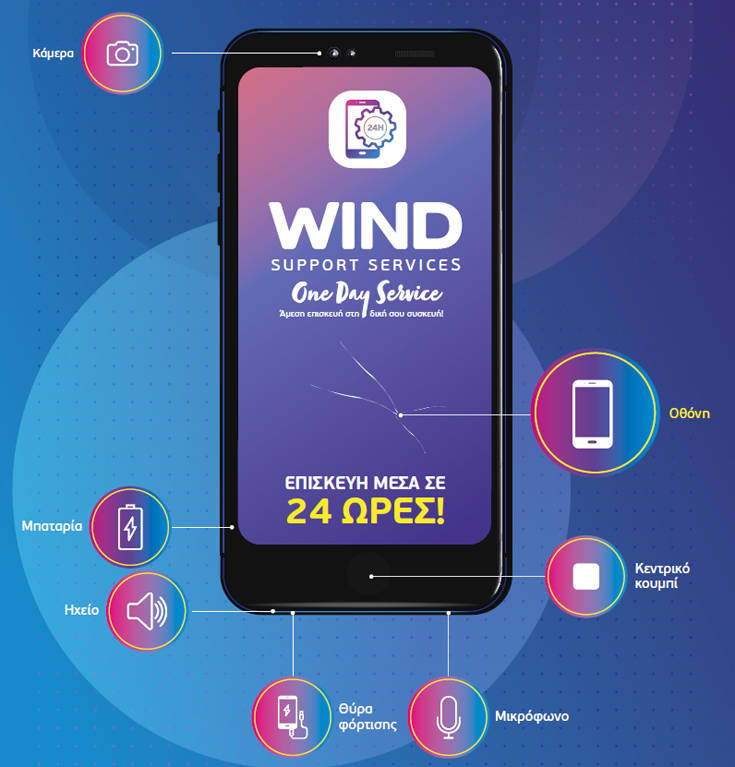 Περισσότερα από 100 καταστήματα WIND αναλαμβάνουν να επισκευάσουν κινητό εκτός εγγύησης μέσα σε μόλις 24 ώρες, με τη νέα υπηρεσία One Day Service. Το μόνο που χρειάζεται είναι ο ενδιαφερόμενος να αφήσει το κινητό του σε ένα κατάστημα WIND και την επόμενη εργάσιμη ημέρα θα βρίσκεται στο κατάστημα επιδιορθωμένο, με 1 χρόνο εγγύηση για την επισκευή.