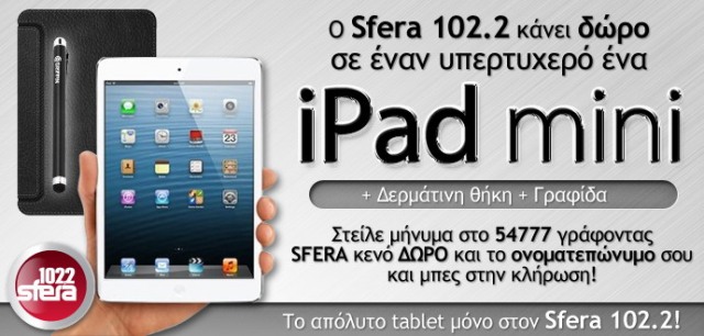 Ο Sfera 102.2 κάνει δώρο σε έναν υπερτυχερό ένα iPad mini με δερμάτινη θήκη και γραφίδα! Στείλε μήνυμα στο 54777 γράφοντας Sfera κενό ΔΩΡΟ και το ονοματεπώνυμο σου και μπες στην κλήρωση!