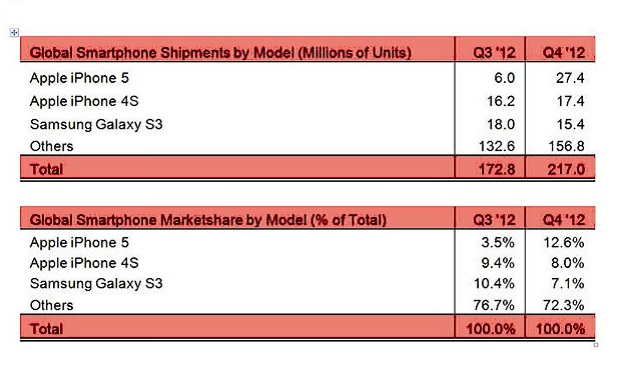 Πιο συγκεκριμένα, το smartphone της Apple κατάφερε να πουλήσει περισσότερες από 27,4 εκατομμύρια μονάδες, κατά τη διάρκεια του τελευταίου τριμήνου του περασμένου έτους, ξεπερνώντας έτσι το Samsung Galaxy S III που έφτασε στα 15,4 εκατομμύρια.