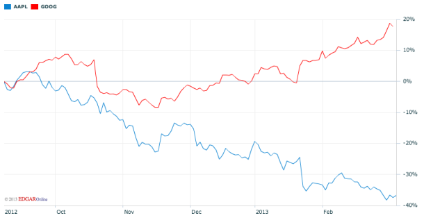 Η Apple βρίσκεται σε μία διαρκή μάχη με την Google, για το ποιος τελικά θα καταφέρει να κερδίσει τους καταναλωτές, με τις υπηρεσίες, τα προϊόντα αλλά και τις καινοτομίες που παρουσιάζουν. Για τη Wall Street όμως τα πράγματα είναι ξεκάθαρα, η Google έχει συνεχώς ανοδική πορεία, ενώ αυτή της Apple φθίνει.
