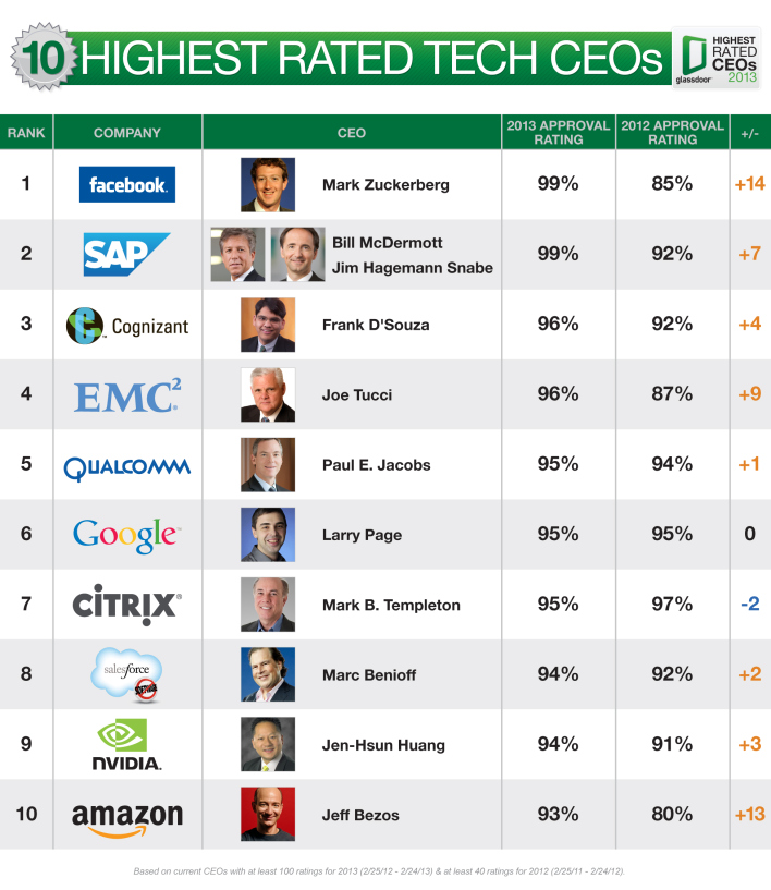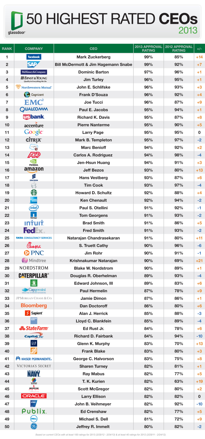 Ένα χρόνο μετά την πρώτη θέση που κατέλαβε ο CEO της Apple, Tim Cook, στην έρευνα της ιστοσελίδας Glassdoor, ως ο γενικός διευθυντής με την μεγαλύτερη αποδοχή από τους υπαλλήλους της εταιρίας του, ο Mark Zuckerberg κατάφερε να τον ξεπεράσει ναι να βρεθεί στην κορυφή της λίστας για τη φετινή χρονιά.