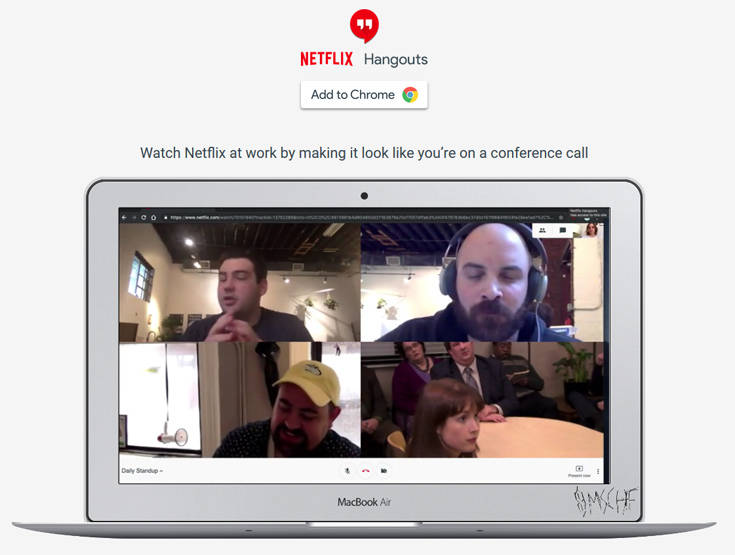 Netflix Hangouts το λένε και είναι ένα νέο extension για τον Chrome που προσπαθεί να κάνει ευκολότερη την παρακολούθηση του Netflix όταν υποτίθεται ότι… δουλεύεις.