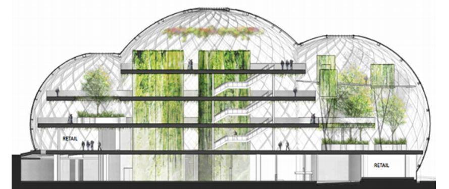 Εκτός από γραφεία, ο θόλος της Amazon θα περιλαμβάνει αίθουσες συνεδριάσεων, εστιατόρια και χώρους επικοινωνίας με το κοινό.