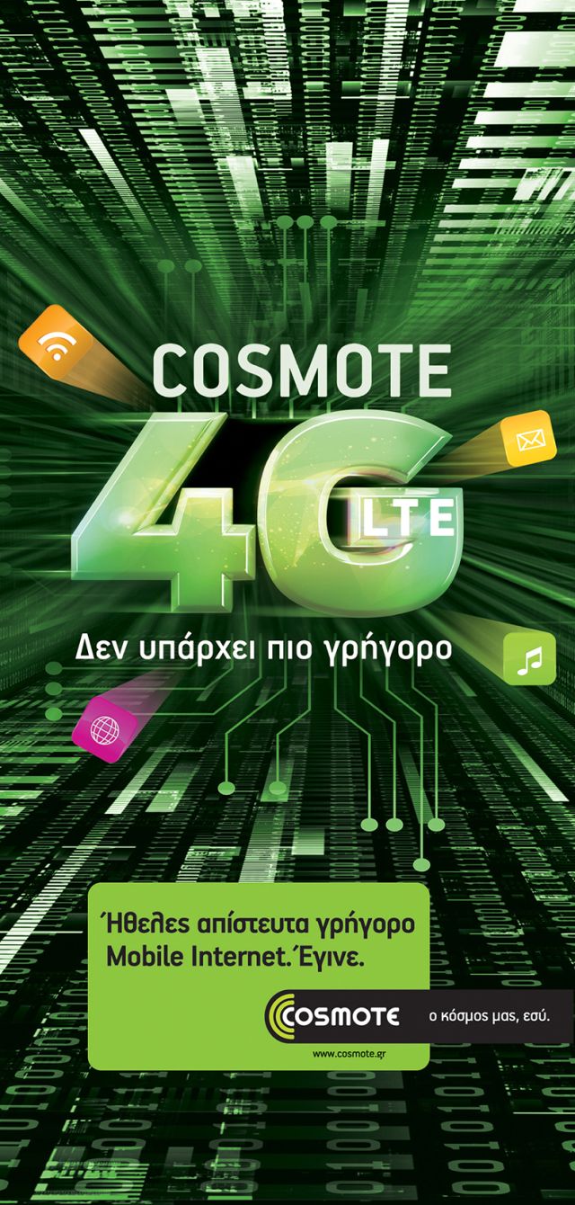 Σε εξέλιξη βρίσκεται η ανάπτυξη του δικτύου 4G της COSMOTE, δίνοντας σε όλο και περισσότερους καταναλωτές τη δυνατότητα να ζήσουν τη μοναδική εμπειρία απίστευτα υψηλών ταχυτήτων Mobile Internet, που πρώτη διέθεσε στην Ελλάδα η COSMOTE.