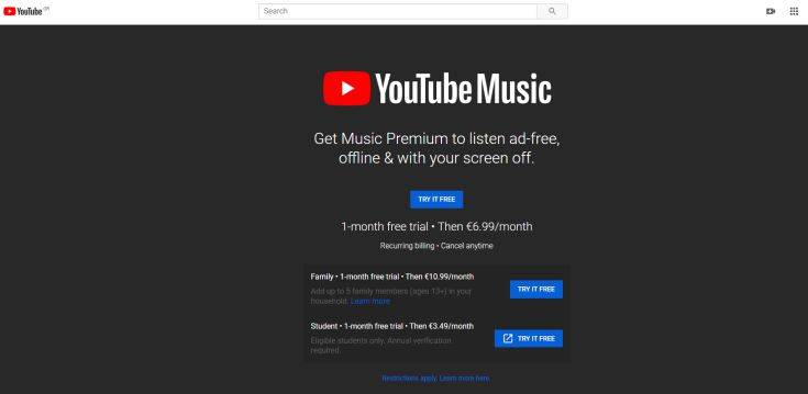 Στις πρώτες ανακοινώσεις που είχαν γίνει για το YouTube Music η τιμή ήταν 9,05 ευρώ το μήνα ενώ τώρα οι χρήστες μπορούν να το αποκτήσουν με συνδρομή 6,99 ευρώ το μήνα. Όπως φαίνεται και στην αρμόδια σελίδα του YouTube η μηνιαία συνδρομή μπορεί να γίνει συνεχόμενη με πάγια εντολή και να ακυρωθεί οποιαδήποτε στιγμή. Οι χρήστες θα μπορούσαν να χρησιμοποιήσουν την υπηρεσία για ένα μήνα δωρεάν. Η διαδικασία προσομοιάζει αρκετά με εκείνη του Netflix.