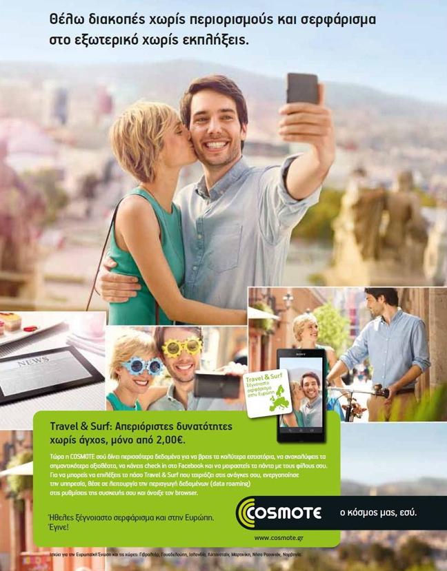 Επιπλέον, με τις νέες μειωμένες χρεώσεις της υπηρεσίας Travel & Surf από την COSMOTE, οι συνδρομητές της που ταξιδεύουν στην Ευρώπη μπορούν, να σερφάρουν στο internet, να στείλουν email, να μάθουν τα νέα των φίλων τους στο Facebook και να αναζητήσουν πληροφορίες και οδηγίες, χωρίς άγχος, μόνο από 2 ευρώ. Επιλέγοντας απλά το πάσο πρόσβασης που χρειάζονται ανάλογα με τις ανάγκες τους και έχοντας πλέον στη διάθεσή τους ακόμα περισσότερα δεδομένα (ΜΒ), πλοηγούνται στο Internet με απόλυτο έλεγχο κόστους και πολύ χαμηλές χρεώσεις.