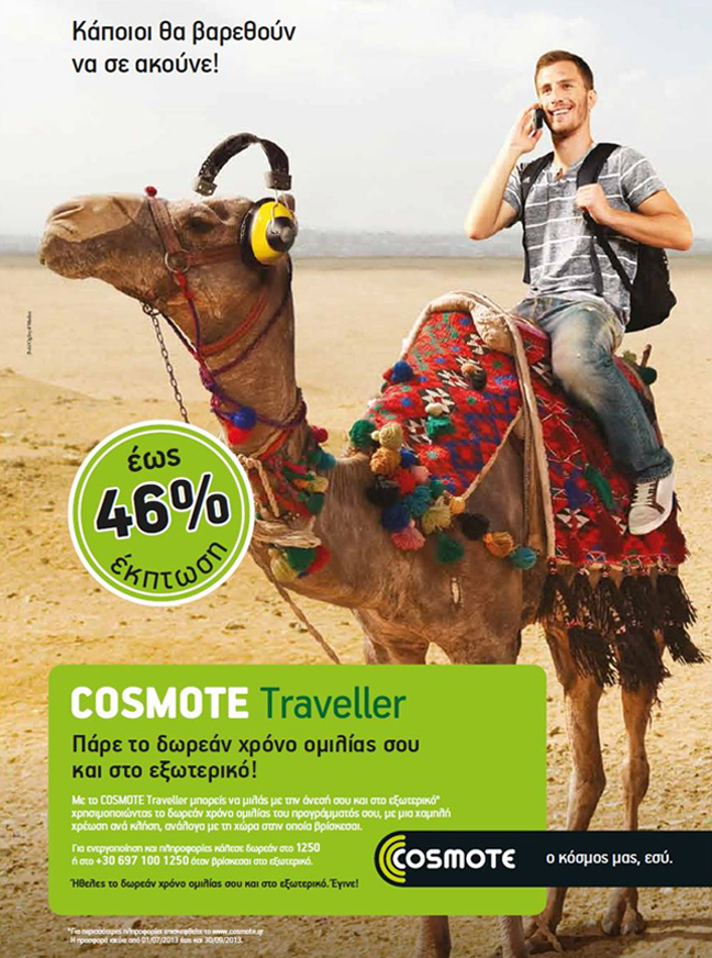 Με εκπτώσεις έως και 46% στο πάγιο τέλος για εξερχόμενες και εισερχόμενες κλήσεις φωνής θα επωφεληθούν φέτος το καλοκαίρι οι συνδρομητές της COSMOTE, ιδιώτες και επαγγελματίες, που θα βρεθούν στο εξωτερικό από την 1η Ιουλίου έως και τις 30 Σεπτεμβρίου 2013, με τη νέα προσφορά της υπηρεσίας COSMOTE Traveller. Έτσι θα μπορούν να μιλούν με ακόμα μεγαλύτερη άνεση χρησιμοποιώντας τον δωρεάν χρόνο ομιλίας του προγράμματός τους και στο εξωτερικό.