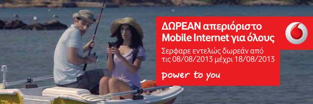 Όλοι οι συνδρομητές συμβολαίου και καρτοκινητής, ιδιώτες και επαγγελματίες, καθώς και οι συνδρομητές Vodafone Internet 4Sharing και Vodafone Mobile Broadband, θα μπορούν να σερφάρουν απεριόριστα απολαμβάνοντας δωρεάν Mobile Internet, με πολιτική ορθής χρήσης 3GB, από τις 8 Αυγούστου έως και 18 Αυγούστου.