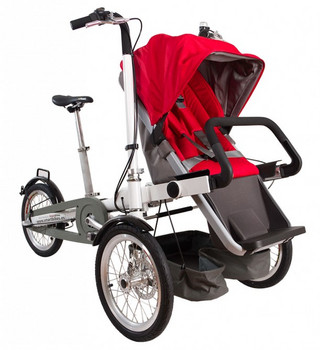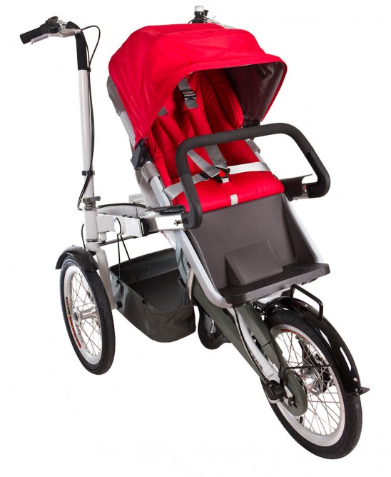 Στη λειτουργία ποδηλάτου, το όχημα εξοπλίζεται με δύο τροχούς στο μπροστινό μέρος και ένα στο πίσω. Στους δύο τροχούς εδράζονται δύο άξονες που ουσιαστικά είναι το τιμόνι του οχήματος, αλλά ταυτόχρονα συγκρατούν και το καλάθι του μωρού.