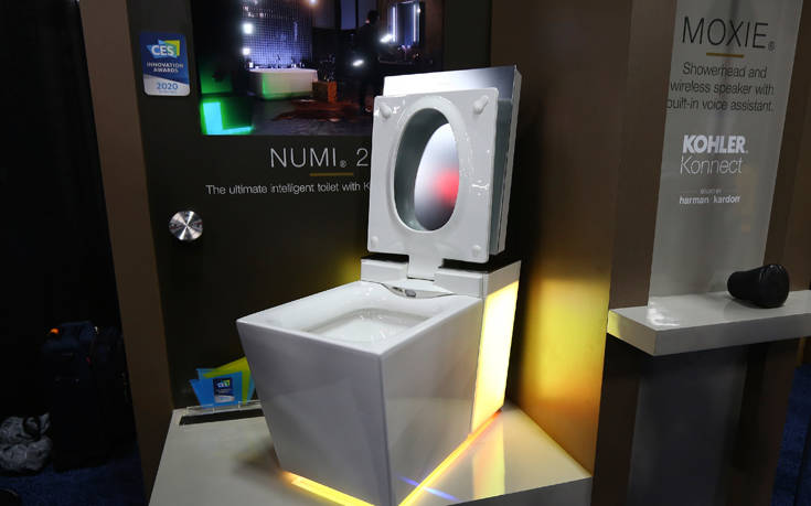 Η αμερικανική εταιρεία Kohler εκθέτει την «έξυπνη» τουαλέτα Numi 2.0, η οποία, μεταξύ άλλων, επιτρέπει στους χρήστες να την προσαρμόζουν ανάλογα με τα γούστα τους μέσω φωνητικών εντολών με τη βοήθεια του ενσωματωμένου ψηφιακού βοηθού Alexa της Amazon. Μεταξύ άλλων, μπορεί κανείς, καθώς μπαίνει στο μπάνιο, να ζητήσει να ανάψει το φως, να ανοίξει μόνο του και να θερμανθεί το κάθισμα της λεκάνης, να τραβηχτεί στη συνέχεια μόνο του το καζανάκι, να αλλάξει ο φωτισμός με διάφορα χρώματα, να ακούγονται στα ηχεία οι ειδήσεις κ.ά. Η Numi 2.0 θα αρχίσει να διατίθεται στην αγορά εντός του 2020 σε τιμή γύρω στα 10.000 δολάρια.