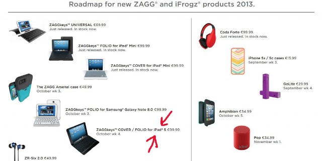 H φήμη ότι το iPad 5 θα παρουσιαστεί σε event της Apple στις 22 Οκτωβρίου κυκλοφορεί εδώ και αρκετό καιρό και ενισχύεται από ένα ντοκουμέντο. Πρόκειται για ένα οργανόγραμμα της γνωστής εταιρείας Zagg, στο οποίο αναφέρεται η κυκλοφορία των διαφόρων αξεσουάρ της για το 2013.