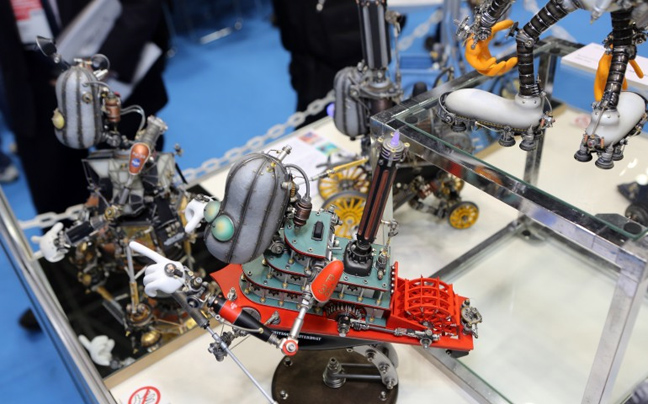 Ειδικότερα, ο δημιουργός χρησιμοποιεί τσιπ, ιμάντες, σωλήνες και γρανάζια –όχι για να κατασκευάσει κάτι λειτουργικό- αλλά για κάτι που θα τραβήξει την προσοχή των επισκεπτών.