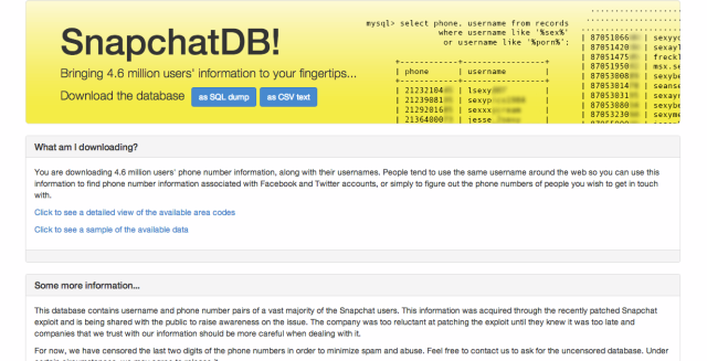 Ένας ιστότοπος κατάφερε να υποκλέψει τα usernames και τους αριθμούς τηλεφώνων 4,6 εκατ. χρηστών και στη συνέχεια δημοσιοποίησε τα στοιχεία και να τα έκανε διαθέσιμα για κατέβασμα από τον οποιοδήποτε. Τα δεδομένα υποκλάπηκαν από την εφαρμογή Snapchat και δημοσιοποιήθηκαν στο site SnapchatDB.info.