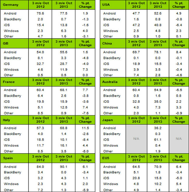 Στις χώρες της EU5 (Βρετανία, Γερμανία, Γαλλία, Ιταλία και Ισπανία), το μερίδιο της αγοράς του iPhone συρρικνώθηκε κατά 5% τους τελευταίους 12 μήνες (σταθεροποιήθηκε στο 15,8%), την ίδια στιγμή που τα Windows Phone εκτοξεύτηκαν από το 4,8% της προηγούμενης χρονιάς στο 10,2% (και το Android σημείωσε αύξηση, από 64,5% στο 70,9%).