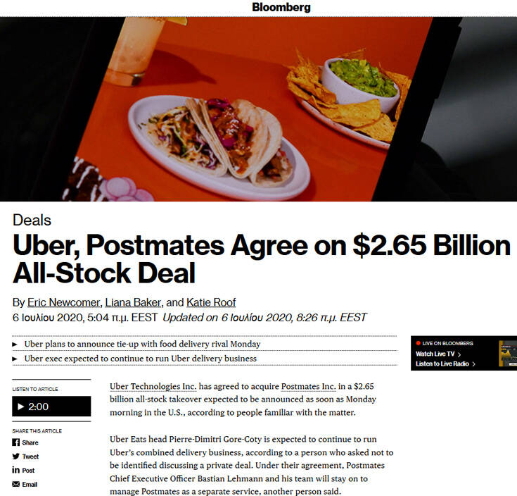 Στην αγορά της εφαρμογής διανομής φαγητού Postmates Inc συμφώνησε η εταιρία προσφοράς υπηρεσιών ιδιωτικών ταξί Uber Technologies Inc, στο πλαίσιο συμφωνίας εξαγοράς μετοχικού πακέτου οικονομικού ύψους 2,65 δισεκατομμυρίων δολαρίων, όπως μετέδωσε το Bloomberg News αργά χθες, επικαλούμενο πηγές που έχουν λάβει γνώση για το ζήτημα, και αναμεταδίδει το ΑΜΠΕ.