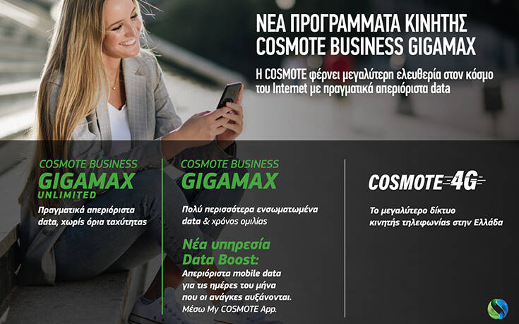 H COSMOTE φέρνει τη νέα σειρά προγραμμάτων συμβολαίου COSMOTE GIGAMAX, για ιδιώτες και επιχειρήσεις, και δίνει τη δυνατότητα στους συνδρομητές της να απολαμβάνουν τον κόσμο του Internet ακόμη πιο ελεύθερα, με πολύ περισσότερα έως και απεριόριστα δεδομένα για το κινητό και χωρίς κανέναν περιορισμό στην ταχύτητα του δικτύου. Σε συνδυασμό με περισσότερη έως και απεριόριστη ομιλία και συνολικά εμπλουτισμένες παροχές, τα νέα προγράμματα της COSMOTE απευθύνονται σε όλους, με τιμές που ξεκινούν από 25€, και προσαρμόζονται στις ανάγκες του κάθε συνδρομητή.