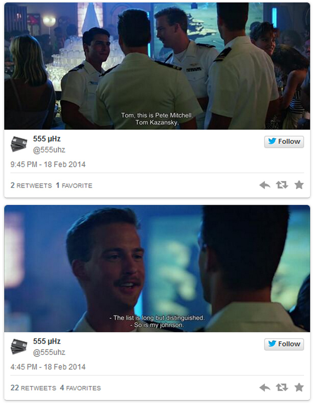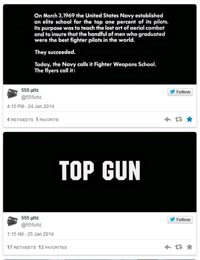 Ο χρήστης λοιπόν της δημοφιλούς πλατφόρμας με όνομα @555uz έκανε τη μεγάλη διαφορά, «τιτιβίζοντας» ολόκληρη την ταινία «Top Gun» ένα frame σε κάθε tweet!