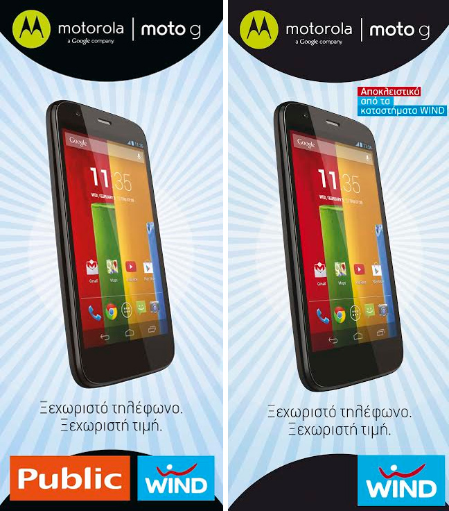 «Τα καταστήματα WIND και τα Public φέρνουν πρώτα στην Ελλάδα το ξεχωριστό Μοtorola Moto G αποκλειστικά για το κοινό που προσέχει την τιμή και θέλει να έχει μια αναβαθμισμένη εμπειρία που να καλύπτει τις ανάγκες του, προσφέροντας παράλληλα περισσότερες λειτουργίες και δυνατότητες πρόσβασης», δήλωσε ο Άρης Παρασκευόπουλος, Υπεύθυνος Mobile Broadband, Υπηρεσιών VAS & Συσκευών της WIND Ελλάς.
