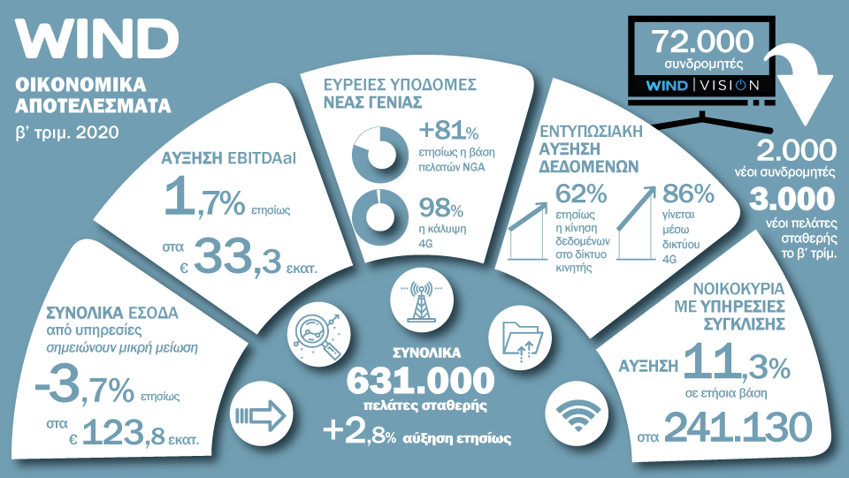 - Η WIND VISION έχει συνολικό αριθμό συνδρομητών 72.000 στο τέλος Ιουνίου, μετρώντας 2.000 νέους στο δεύτερο τρίμηνο του 2020