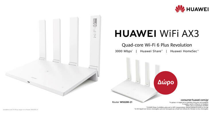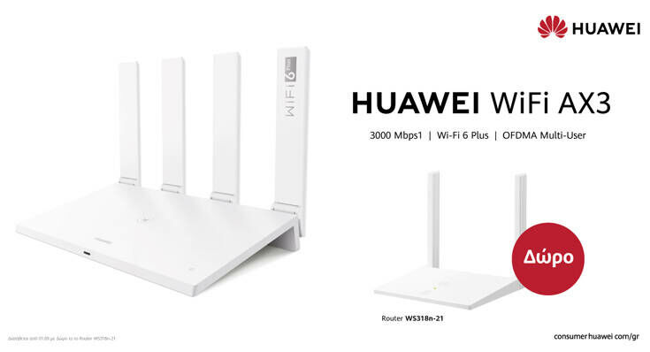 - Το Dual-core Huawei WiFi AX3 διατίθεται για προπαραγγελία από το δίκτυο επίσημων συνεργατών της Huawei (Γερμανός, Κωτσόβολος, Public, MediaMarkt) από 1 Σεπτεμβρίου έως και 9 Σεπτεμβρίου 2020, και μέχρι εξαντλήσεως των αποθεμάτων, με δώρο το Huawei router WS318n-21.