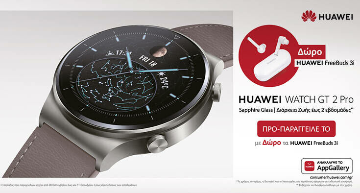 - Από 28/9 μέχρι 11/10, το Watch GT 2 Pro διατίθεται για προπαραγγελία με δώρο τα Freebuds 3i!