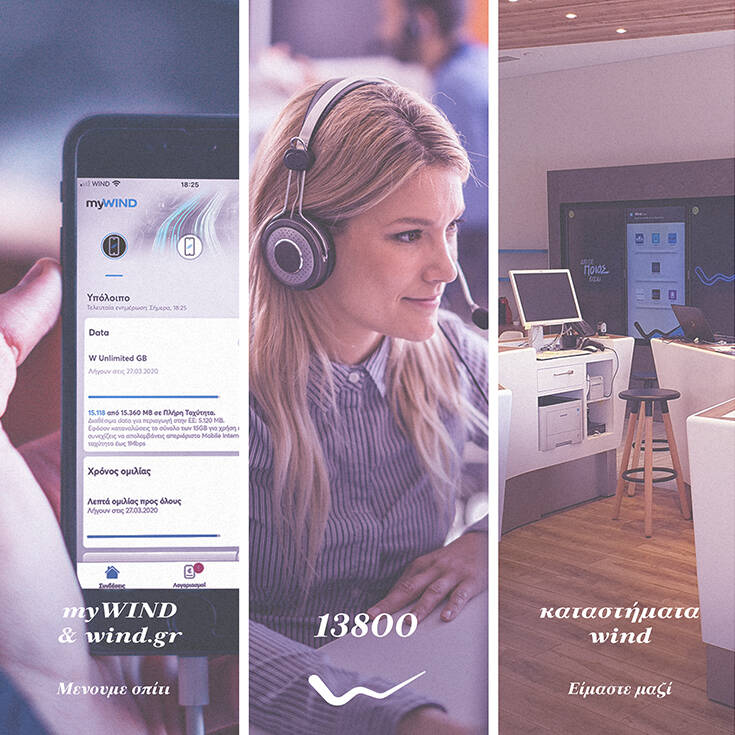 Η WIND συστήνει σε όλους τους καταναλωτές να παραμείνουν σπίτι και να εξυπηρετούνται από εκεί. Μέσω του site wind.gr, και των εφαρμογών myWIND , myF2G ,myQ οι χρήστες εύκολα, γρήγορα και με ασφάλεια έχουν την δυνατότητα: