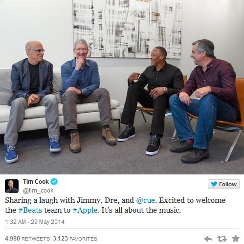 Σε συνέντευξη του, ο CEO της Apple, Tim Cook, χαρακτήρισε τους Dr Dre και Iovine «καταπληκτικά δημιουργικούς ανθρώπους» και τόνισε ότι το μέλλον για τις δύο εταιρείες θα είναι πολύ καλύτερο τώρα που είναι μαζί απ’ ό,τι αν ήταν χωριστά.