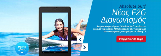 Ενεργοποιώντας το νέο πακέτο Absolute Surf, για 5GB Mobile Internet, οι συνδρομητές WIND F2G λαμβάνουν μέρος στο διαγωνισμό για να διεκδικήσουν το tablet ASUS Fonepad 7 3G.